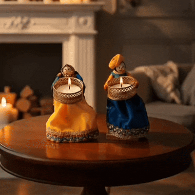 Illuminate your home with this elegant pair of Handcrafted Traditional Couple Tea Light Candle Holders. Designed in charming ethnic attire, these figurines beautifully hold tea lights, bringing a warm and festive glow to your space. Each piece is crafted with care using premium materials and vibrant fabrics, making it a perfect décor choice for Diwali, Christmas, weddings, and festive occasions.